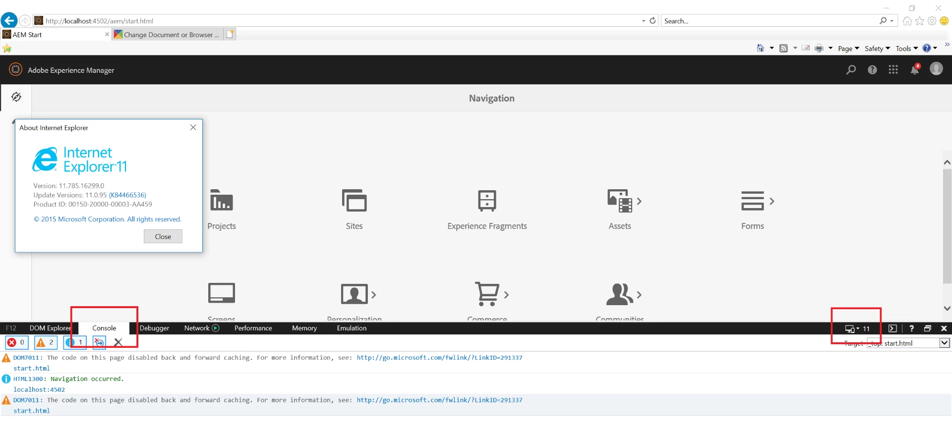 AEM 6.4 /aem/start.html icons not apprearing in IE11 browser