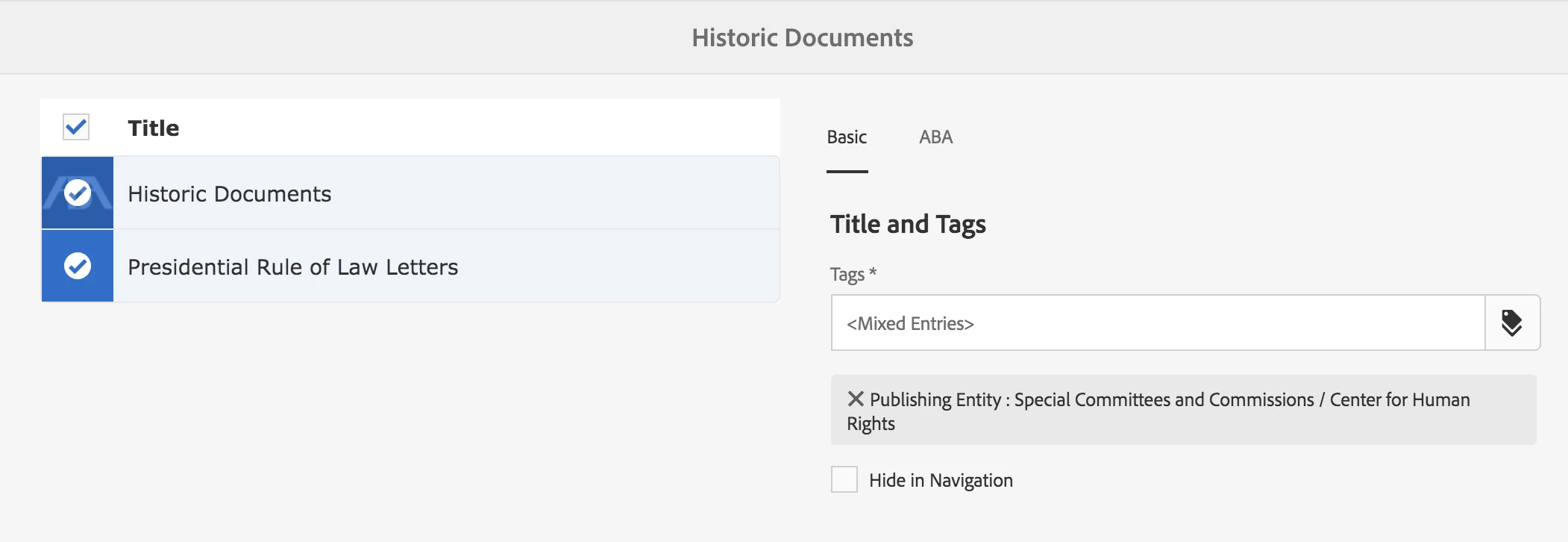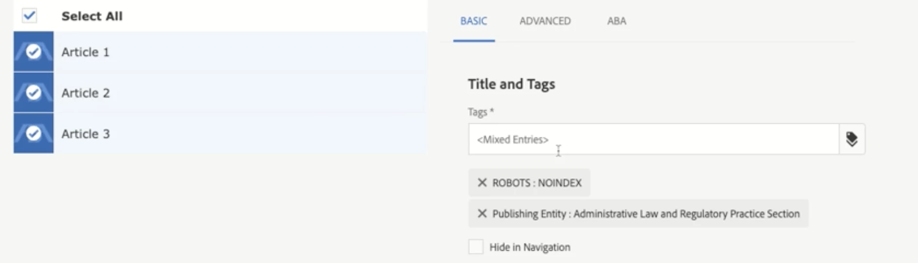 In 6.2 we were able to select multiple pages and then properties to allow bulk editing. The path browser option to select tags was active regardless of the values of the currently selected tags for the pages. The common tags were displayed and any new tag selected was added to the tag set for each of the pages.
