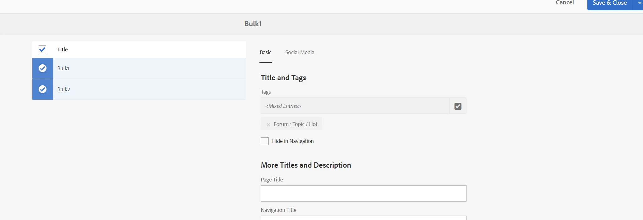 I enabled bulkupdate to add/change properties for multiple pages in bulk. But when pages have mixed entries for tags the option to add/delete is disabled. Anyway to enable this option or override the functionality to add/delete tags?