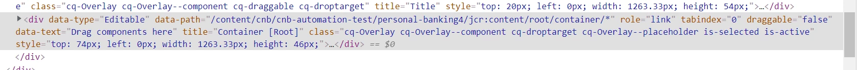 But once page is created we're unable to locate container component element to drag and drop the components. Please see the screenshots below DOM for container component.