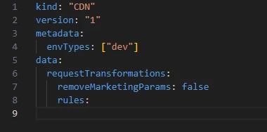 2025-04-02T04:45:48+0000 Error in config kind 'CDN': [/requestTransformations]: must have required property 'rules'. Actual properties: ['removeMarketingParams']. Required properties: ['rules'].