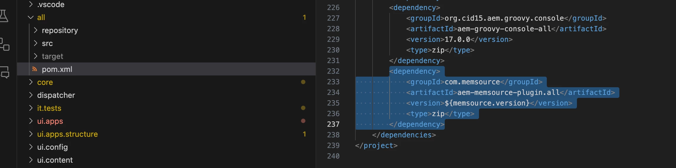 <dependency> <groupId>com.memsource</groupId> <artifactId>aem-memsource-plugin.all</artifactId> <version>${memsource.version}</version> <type>zip</type> </dependency>