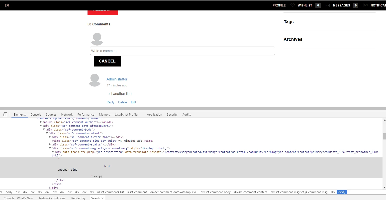 I was trying to add comments with line break using OOTB comments component (we-retail blog). I see that when I make a comment with line break (richtext disabled in component properties). I see the comment posted in a single line. Please see image below