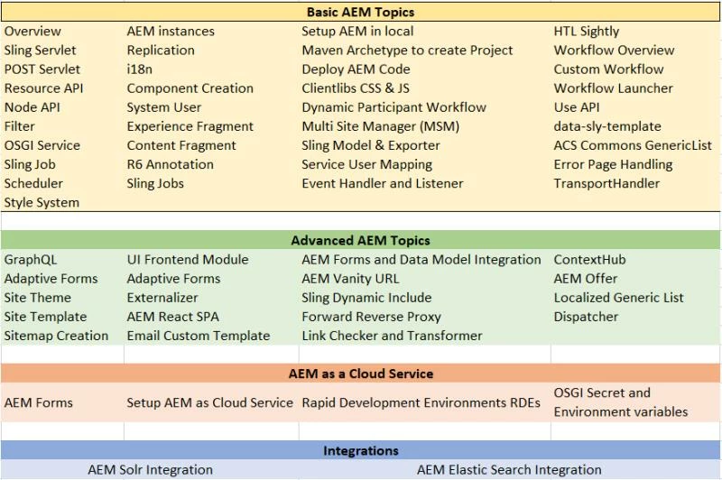 It contains all types of topics that will help us build our concepts and create an AEM project with both basic and advanced concepts.