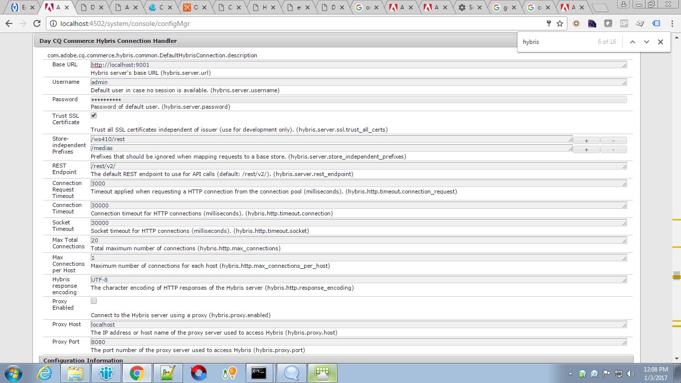 I have provided below connection params in configMgr (Day CQ Commerce Hybris Connection Handler)