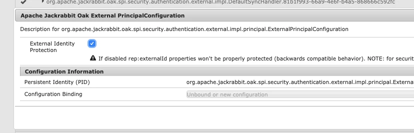 - Under "Apache Jackrabbit Oak External PrincipalConfiguration" DISABLE "External Identity Protection" (attached screenshot