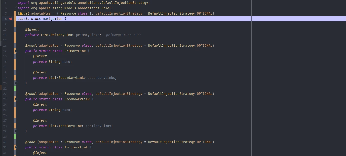 I have it working fairly well using interfaces, but when I try to implement a class based approach AEM no longer seems to pick up my primaryLinks / secondaryLinks / tertiaryLinks content. From what I can tell in the AEM documentation here: https://sling.apache.org/documentation/bundles/models.html#collections it seems like it should be possible for the Sling Model to pick up the List just by using @586265. Am I missing something here? I've also attached an image of the content I'm attempting to work with along w/ code below.