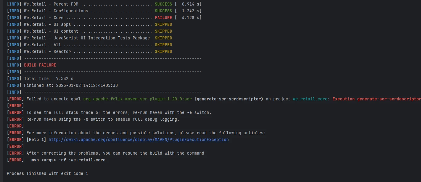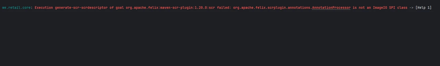 I downloaded aem-sample-we-retail-master code from GitHub, and I got below errors while trying to build using command mvn clean install -PautoInstallPackage.