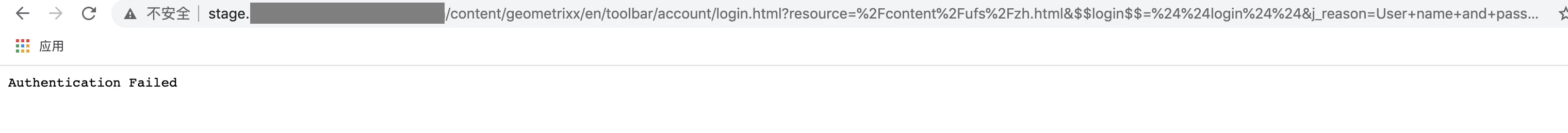 But, after entered the correct credentials the stage site is redirecting to url like this "http://stage.sample.com/content/geometrixx/en/toolbar/account/login.html?resource=%2Fcontent%2Fufs%2Fzh.html&$$login$$=%24%24login%24%24&j_reason=User+name+and+password+do+not+match&j_reason_code=invalid_login", and given below error.