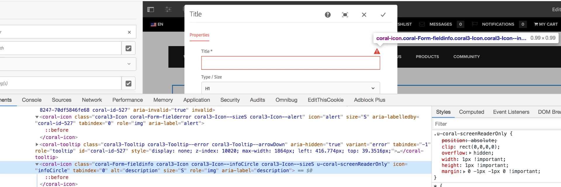 I have a title component(touch-ui) in my project and made the title field mandatory by setting required(boolean) – true at the title property level. Now, when we save the dialog with an empty title field, validation fires up, but the triangular icon overlaps the description icon in the component. See screenshots below. Is there any way to resolve this?