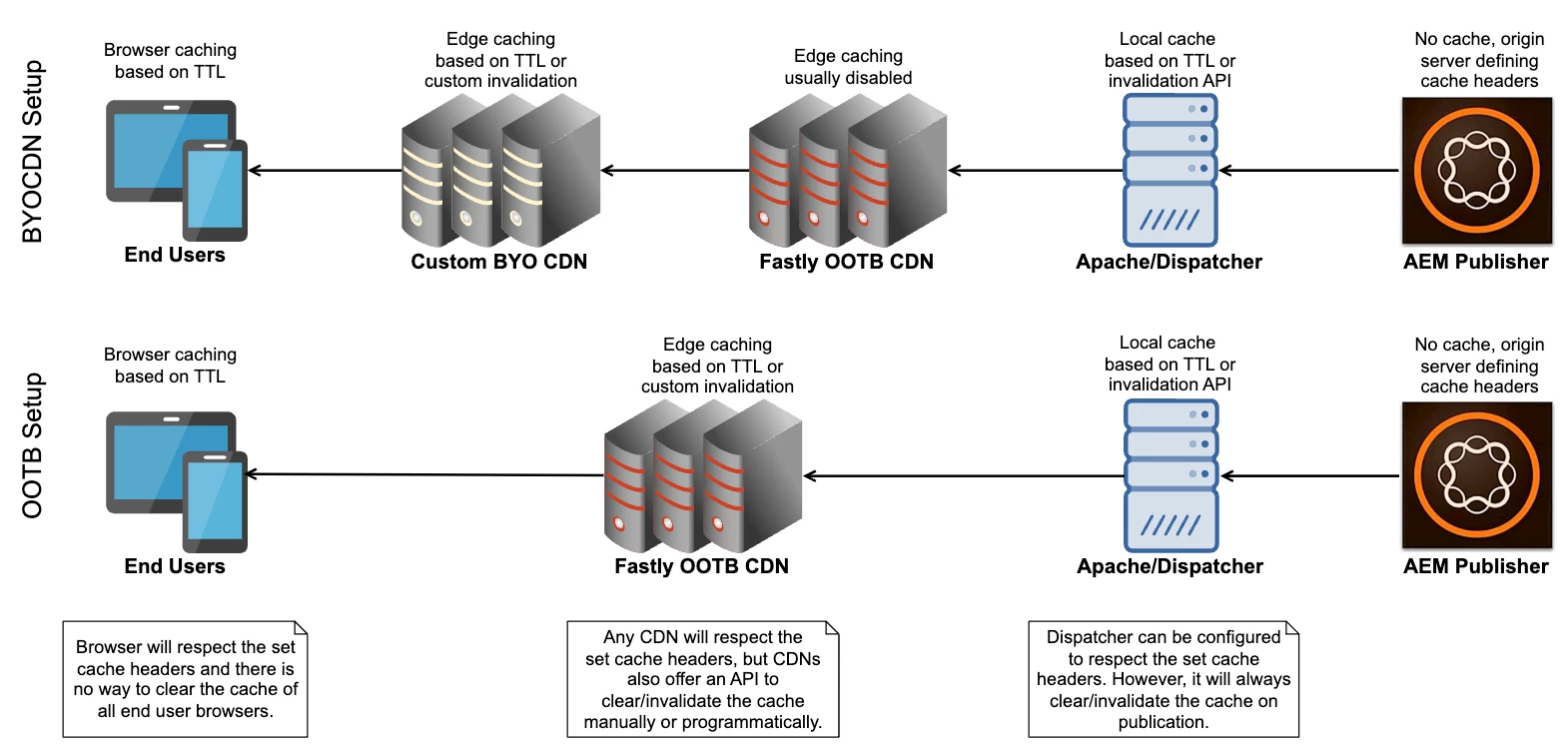 - Works OOTB with the Dispatcher cache, but requires custom implementation for the CDN cache.