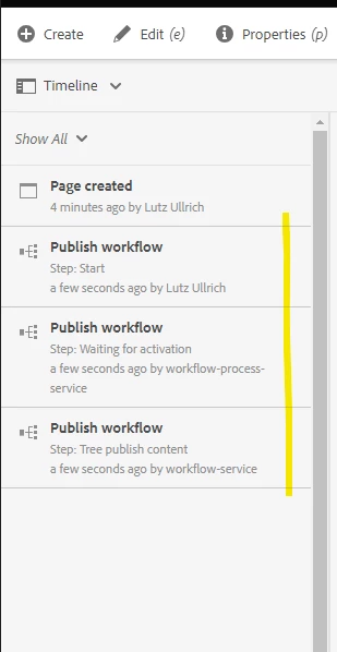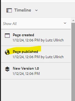 | Request for Feature Enhancement (RFE) Summary: | Currently when you use Manage Publication functionality to publish/unpublish pages, the timeline does NOT provide information about the target so that you can not see to which target it was published/unpublished. And instead of "Page published" entry like in AEM 6.5.16 on Prem only workflow steps are visible which is confusing. |