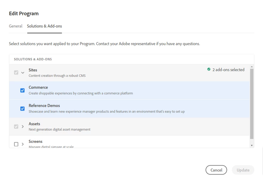 2. Added new program with the selected Add-Ons like Commerce, Reference Demos under sites. PFA.