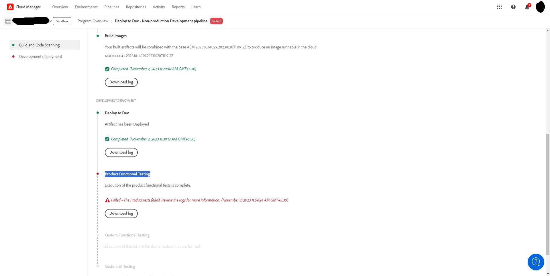 AEMaaCS Sandbox Deployment fails