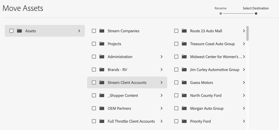 | Current/Experienced Behavior: | Currently, there is no way to sort the list of folders in the Select Destination step when moving assets. It requires our team to scroll through our entire list of client folders when needing to move assets. The folders also do not populate automatically by alpha |