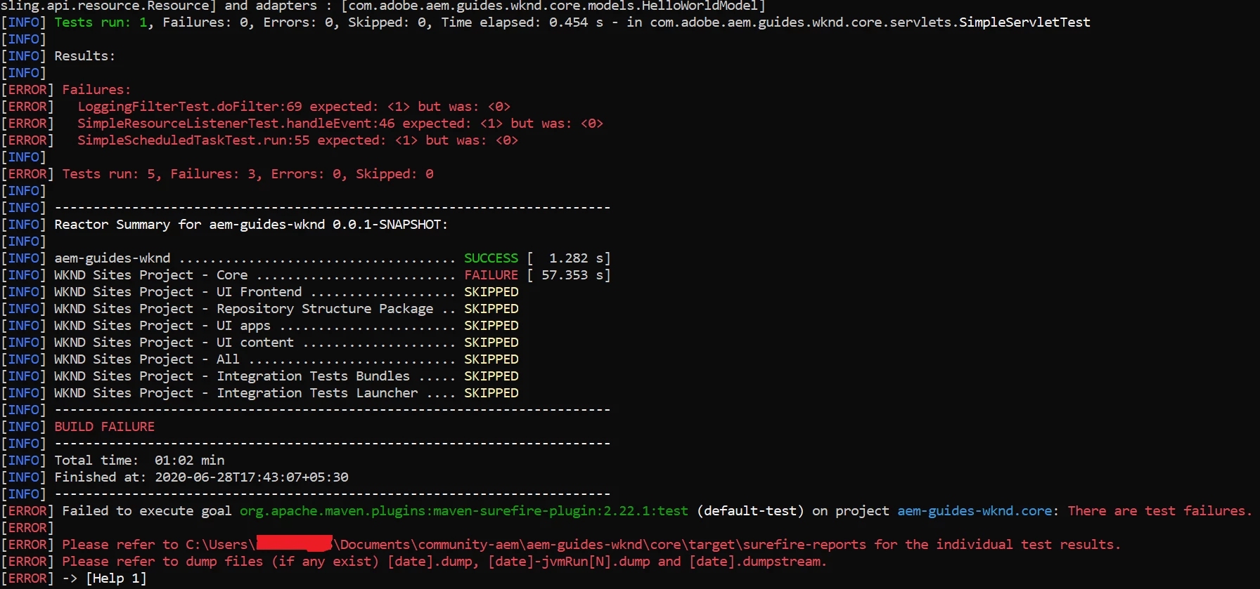 [INFO] BUILD FAILURE [INFO] ------------------------------------------------------------------------ [INFO] Total time: 6.295 s [INFO] Finished at: 2020-06-28T00:33:12+00:00 [INFO] Final Memory: 46M/746M [INFO] ------------------------------------------------------------------------ [ERROR] Failed to execute goal org.apache.maven.plugins:maven-surefire-plugin:2.22.1:test (default-test) on project aem-guides-wknd.core: There are test failures. [ERROR] [ERROR] Please refer to /home/user746/develop/aem-guides-wknd/core/target/surefire-reports for the individual test results. [ERROR] Please refer to dump files (if any exist) [date].dump, [date]-jvmRun[N].dump and [date].dumpstream. [ERROR] -> [Help 1] org.apache.maven.lifecycle.LifecycleExecutionException: Failed to execute goal org.apache.maven.plugins:maven-surefire-plugin:2.22.1:test (default-test) on project aem-guides-wknd.core: There are test failures. Please refer to /home/user746/develop/aem-guides-wknd/core/target/surefire-reports for the individual test results. Please refer to dump files (if any exist) [date].dump, [date]-jvmRun[N].dump and [date].dumpstream. at org.apache.maven.lifecycle.internal.MojoExecutor.execute(MojoExecutor.java:212) at org.apache.maven.lifecycle.internal.MojoExecutor.execute(MojoExecutor.java:153) at org.apache.maven.lifecycle.internal.MojoExecutor.execute(MojoExecutor.java:145) at org.apache.maven.lifecycle.internal.LifecycleModuleBuilder.buildProject(LifecycleModuleBuilder.java:116) at org.apache.maven.lifecycle.internal.LifecycleModuleBuilder.buildProject(LifecycleModuleBuilder.java:80) at org.apache.maven.lifecycle.internal.builder.singlethreaded.SingleThreadedBuilder.build(SingleThreadedBuilder.java:51) at org.apache.maven.lifecycle.internal.LifecycleStarter.execute(LifecycleStarter.java:128) at org.apache.maven.DefaultMaven.doExecute(DefaultMaven.java:307) at org.apache.maven.DefaultMaven.doExecute(DefaultMaven.java:193) at org.apache.maven.DefaultMaven.execute(DefaultMaven.java:106) at org.apache.maven.cli.MavenCli.execute(MavenCli.java:863) at org.apache.maven.cli.MavenCli.doMain(MavenCli.java:288) at org.apache.maven.cli.MavenCli.main(MavenCli.java:199) at sun.reflect.NativeMethodAccessorImpl.invoke0(Native Method) at sun.reflect.NativeMethodAccessorImpl.invoke(NativeMethodAccessorImpl.java:62) at sun.reflect.DelegatingMethodAccessorImpl.invoke(DelegatingMethodAccessorImpl.java:43) at java.lang.reflect.Method.invoke(Method.java:498) at org.codehaus.plexus.classworlds.launcher.Launcher.launchEnhanced(Launcher.java:289) at org.codehaus.plexus.classworlds.launcher.Launcher.launch(Launcher.java:229) at org.codehaus.plexus.classworlds.launcher.Launcher.mainWithExitCode(Launcher.java:415) at org.codehaus.plexus.classworlds.launcher.Launcher.main(Launcher.java:356) Caused by: org.apache.maven.plugin.MojoFailureException: There are test failures. Please refer to /home/user746/develop/aem-guides-wknd/core/target/surefire-reports for the individual test results. Please refer to dump files (if any exist) [date].dump, [date]-jvmRun[N].dump and [date].dumpstream. at org.apache.maven.plugin.surefire.SurefireHelper.throwException(SurefireHelper.java:289) at org.apache.maven.plugin.surefire.SurefireHelper.reportExecution(SurefireHelper.java:161) at org.apache.maven.plugin.surefire.SurefirePlugin.handleSummary(SurefirePlugin.java:364) at org.apache.maven.plugin.surefire.AbstractSurefireMojo.executeAfterPreconditionsChecked(AbstractSurefireMojo.java:1041) at org.apache.maven.plugin.surefire.AbstractSurefireMojo.execute(AbstractSurefireMojo.java:857) at org.apache.maven.plugin.DefaultBuildPluginManager.executeMojo(DefaultBuildPluginManager.java:134) at org.apache.maven.lifecycle.internal.MojoExecutor.execute(MojoExecutor.java:207) ... 20 more [ERROR]