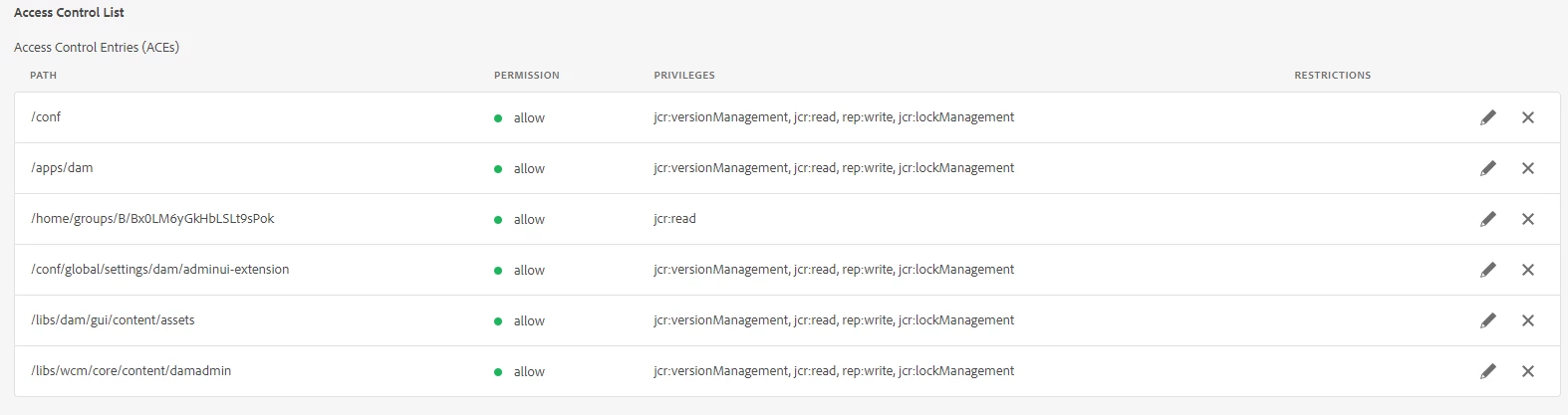 Setting the permissions as specified to our created Group does in fact allow the user to enter the schema after clicking "edit", but when the form opens, it has a "lock" across it, allowing no fields to be added, deleted, or updated/edited. I have found other articles mentioning combinations of read/write/create/delete access to other locations such as "/libs/dam/gui/content/assets" and "libs/wcm/core/content/damadmin", but came up empty with results. Our path "/conf/global/settings/dam/adminui-extension" also seems to consistently disallow the Modify here as "noneffective." Not sure if this could be a root issue but is the next step we are looking at.