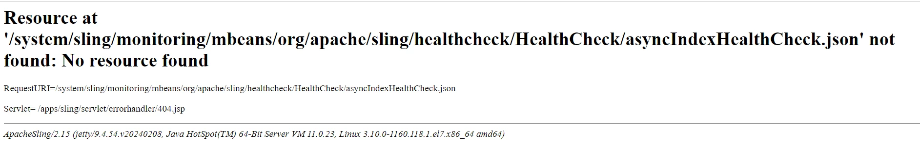 After the SP21 upgrade, I've seen the 'NO resource found' error at https://<IP>:<PORT>/system/sling/monitoring/mbeans/org/apache/sling/healthcheck/HealthCheck/asyncIndexHealthCheck.json which was completely fine on SP20.