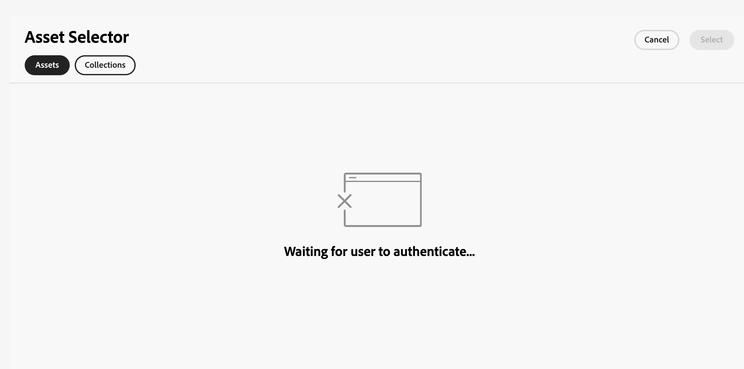 Then the popup gets replaced by the Coral UI Asset Selector Tab with message “Waiting for user to authenticate...”