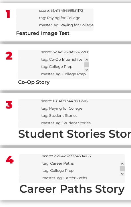 Based on the query above, with "College Prep" being queried as the masterTag, I believe that the #2 story should appear first (in addition to the scores being different).