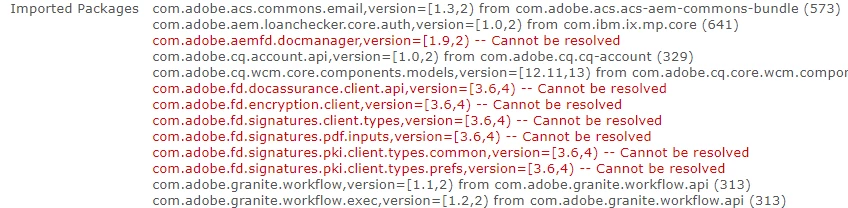 - [ERROR] [api-regions-exportsimports] com.adobe.aemfd:aemfd:-client-sdk: Bundle aemfd:-client-sdk is importing package(s) [com.adobe.idp.um.api.infomodel, com.rits.cloning, com.adobe.aemds.bedrock, com.adobe.livecycle.content.model.annotation, com.adobe.aemfd.docmanager.internal.passivation.jcr, org.dom4j.io, com.adobe.fd.signatures.pki.impl, org.omg.CORBA, com.adobe.icc.data, com.adobe.ps.cm.config, com.adobe.fd.signatures.hsm, com.adobe.fd.signatures.hsm.api, com.adobe.fd.signatures.impl, net.sf.beanlib.provider.finder, com.adobe.livecycle.content.appcontext, com.adobe.fd.signatures.pki.revocation.crl, com.adobe.exm.expeval.functionutil, com.adobe.internal.pdfm.util, org.dom4j, com.adobe.aemfd.docmanager.internal.persistence, com.adobe.service, com.adobe.fd.signatures.hsm.internal.transaction.util, com.adobe.aemfd.docmanager.internal.passivation, com.adobe.aemfd.docmanager.internal.passivation.url, com.adobe.livecycle.content.activate.exception, com.adobe.fd.signatures.pki.cert, org.dom4j.dom, org.apache.commons.el, net.sf.beanlib.spi, com.adobe.fd.signatures.truststore.businessobject, net.sf.beanlib.provider.replicator, com.adobe.aemds.formset.utils, com.adobe.fd.signatures.pki.client.types, net.sf.beanlib.provider, com.adobe.aemds.guide.progressive, com.adobe.livecycle.content.repository, com.adobe.aemfd.docmanager.internal.source, com.adobe.fd.fp.util, com.adobe.fd.signatures.pki.client] in start level 20 but no bundle is exporting these for that start level.