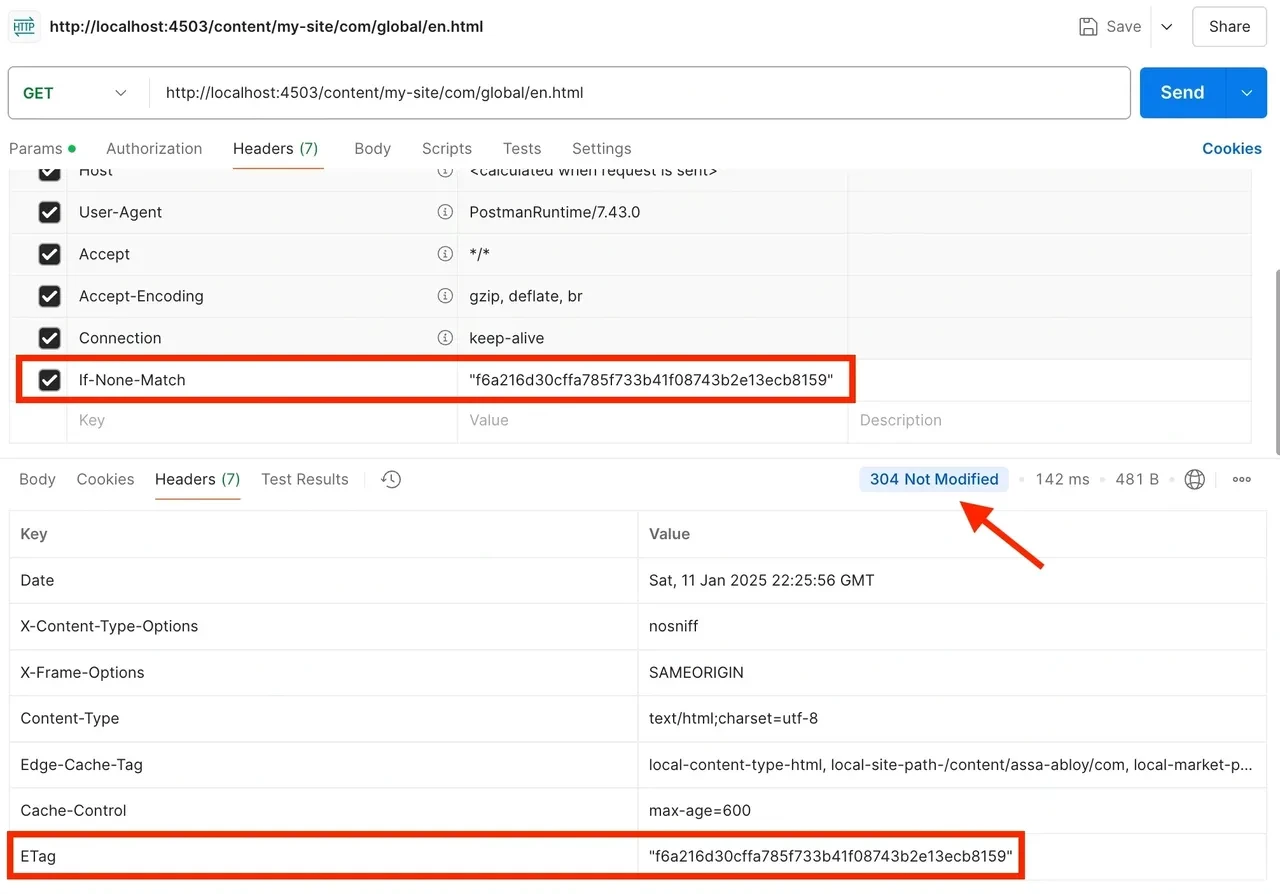 - Saves bandwidth by not resending the resource again if the client's ETag value is the same as the current ETag value of the resource on the server