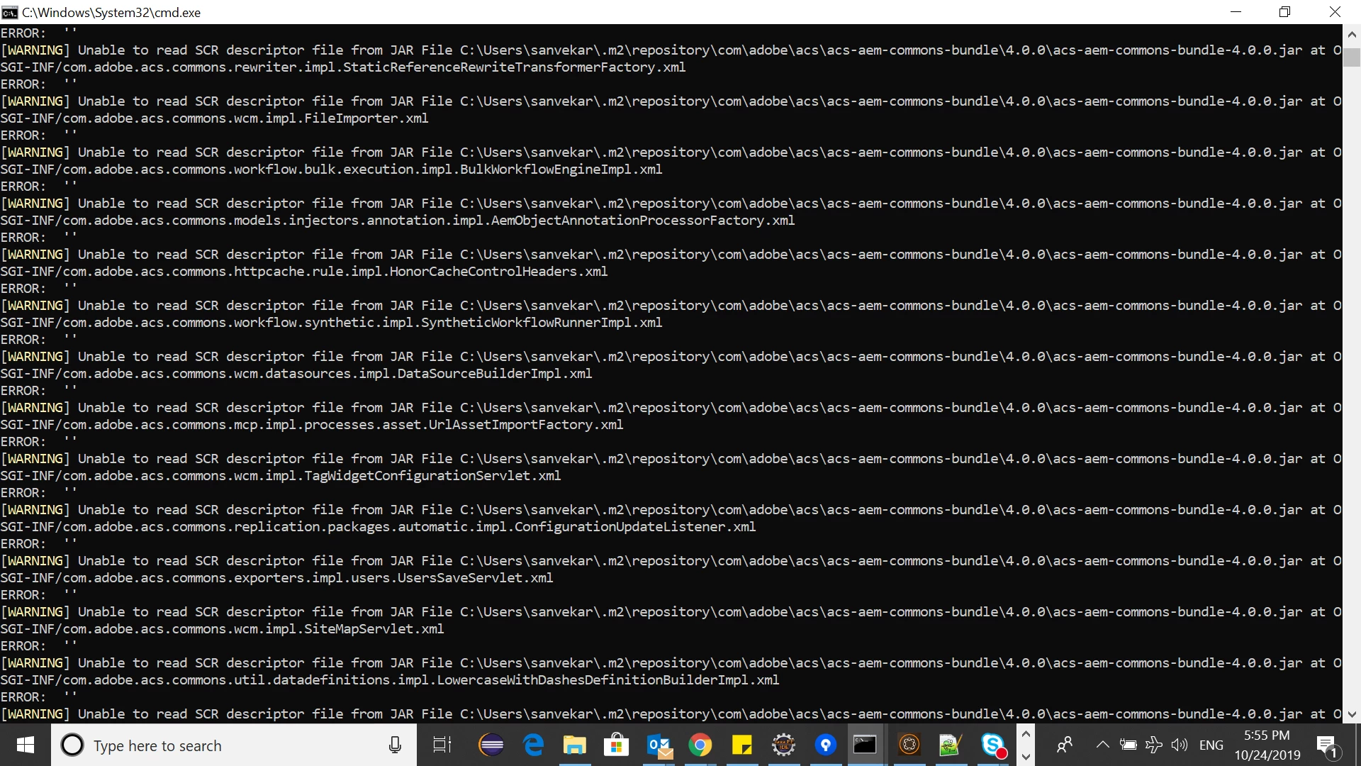 [WARNING] Unable to read SCR descriptor file from JAR File C:\Program Files\apache-maven-3.5.4\repository\io\tikaltechnologies\danta\aem\1.0.5\aem-1.0.5.jar at OSGI-INF/danta.aem.servlets.ImageRenditionOptionsExtJSONServlet.xml