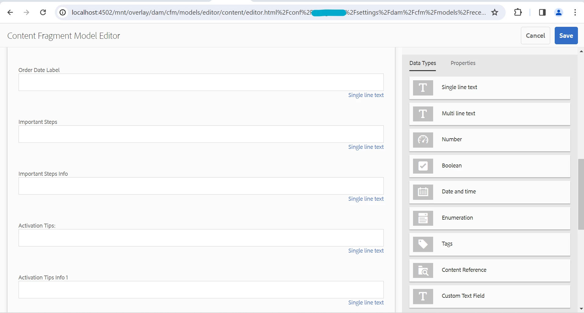 I have added some fields in the content fragment configuration but they are not reflecting in the existing content fragment model, in the 1st image after "Order Date Label" I have added 4 fields, but in the 2nd photo they are not coming up, what can be the issue, am I missing something?