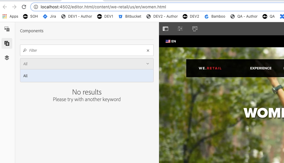 With my Local instance, I'm having an issue accessing components via the dropdown menu/ filter.