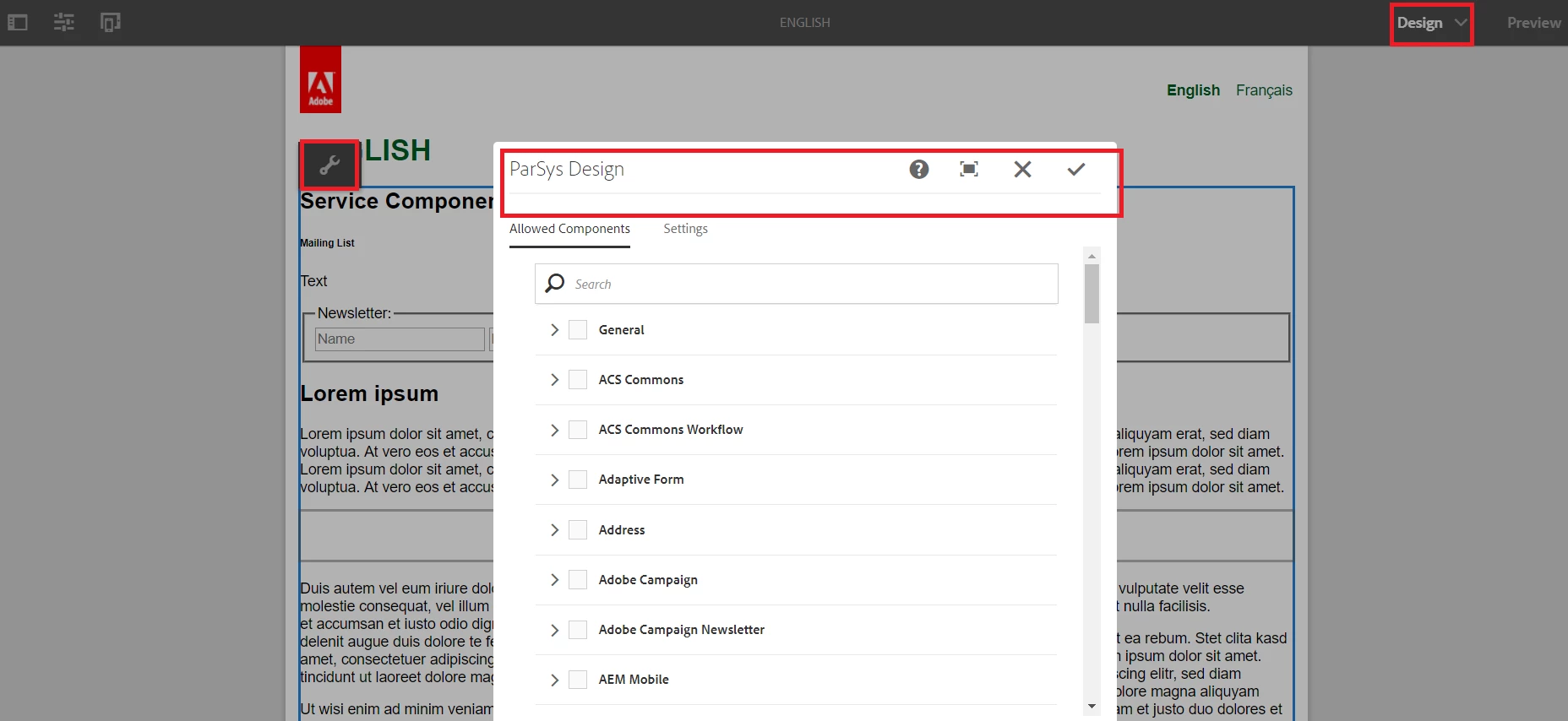 > I have selected the components in design mode parsys. This is working good in classic UI sidekick. I can see all the components there but not in touch UI.