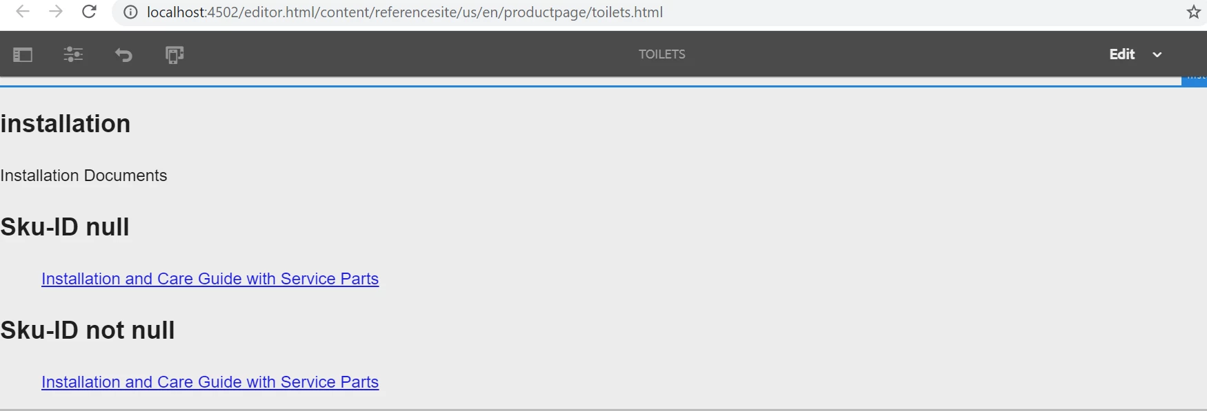 Now , my requirement is that if Sku ID is blank ("null") then it will display the installation document link in sightly