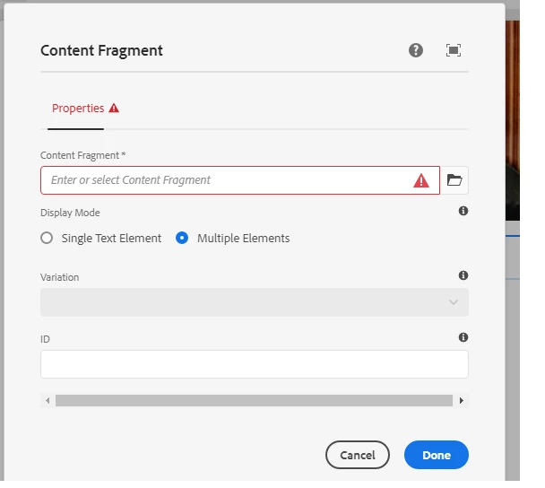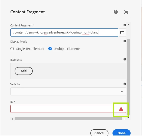 Setting up content fragment property "required=true" for id and fragment path field in the CF component.