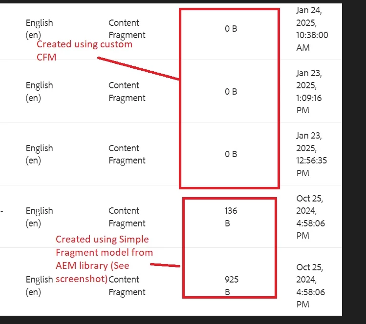 | Current/Experienced Behavior: | Create a Content fragment model in Tools->Assets->Content Fragment Models. Go to Navigation->Assets, click create, select content fragment from the drop-down. Select the content fragment model you created. Enter data into CF and click save. Change the view in Assets folder to List view, the size column for this content fragment shows 0B. When you create a content fragment which uses an OOB AEM CFM, the size is calculated correctly |