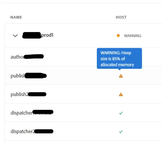 | Use-case: | The Cloud Manager Portal - Reports displays a System Monitoring stat for all the environments and servers in terms of Host, Network, Storage and Application. Sometimes it displays in warning "Heap size is 85% of the allocated memory" If you check the server in question, mostly the figures don't align - For instance in the publish server for which the warning was flashed the usage was around 35-40% which is way off the warning limits. Ideally there should be a strong co-relation between these 2 figures. |