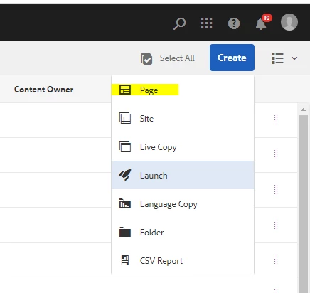 Create >Page option under column view is not available for some folders in AEM 6.5 sites.html console