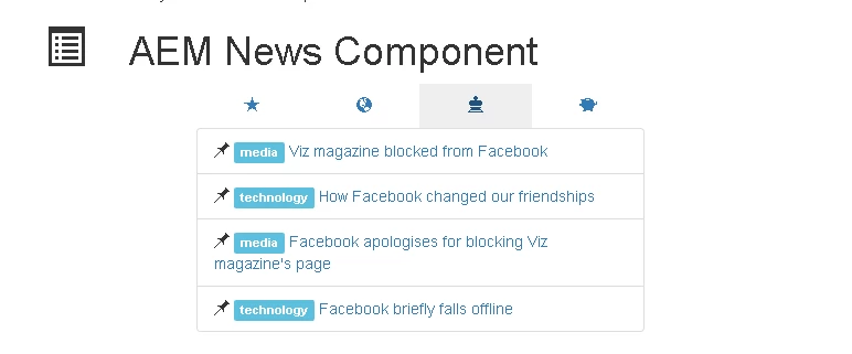 You can create an Adobe Experience Manager (AEM) Headline component that you can use in your AEM web page. A headline component lets you website visitors view latest headlines about a specific subject. That is, you can enter keyword into an AEM dialog and the component will display headlines related to the keyword. For example, you can enter Facebook keyword and the component displays headlines, as shown in the following illustration.