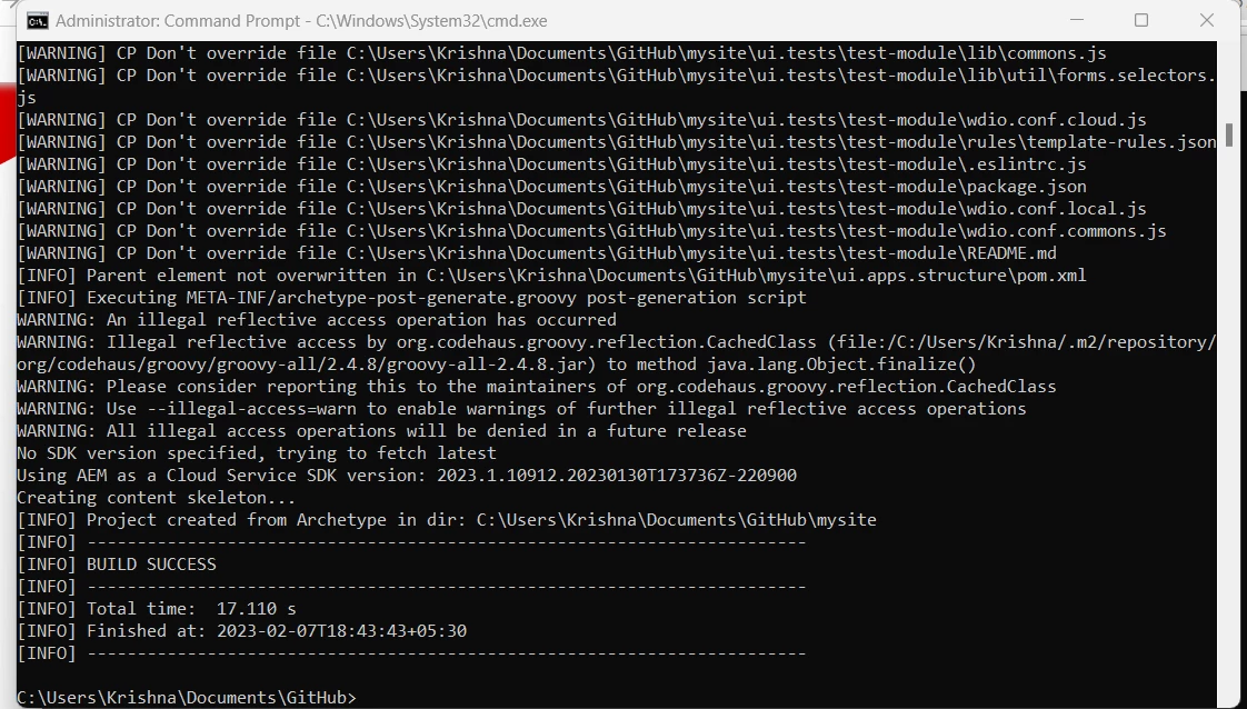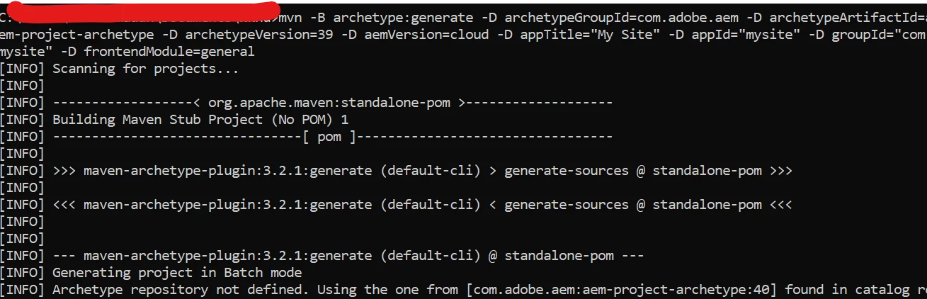 Command Used: mvn -B archetype:generate \ -D archetypeGroupId=com.adobe.aem \ -D archetypeArtifactId=aem-project-archetype \ -D archetypeVersion=39 \ -D aemVersion=cloud \ -D appTitle="My Site" \ -D appId="mysite" \ -D groupId="com.mysite" \ -D frontendModule=general \ -D includeExamples=n