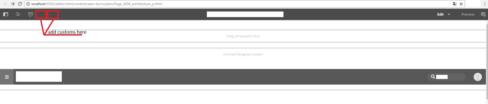 2. For adding items in editor bar, you need to add new nodes at /libs/wcm/core/content/editor/jcr:content/content/items/content/header/items/headerbar/items