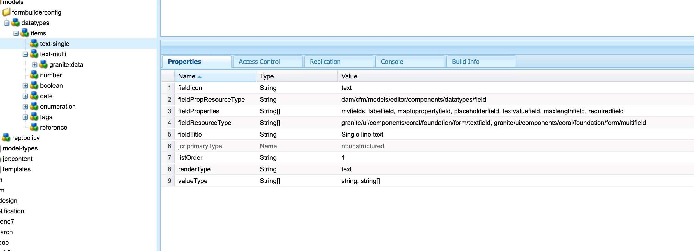 You can find the list of content fragment, data types, configuration from here, http://localhost:4502/crx/de/index.jsp#/libs/settings/dam/cfm/models/formbuilderconfig/datatypes
