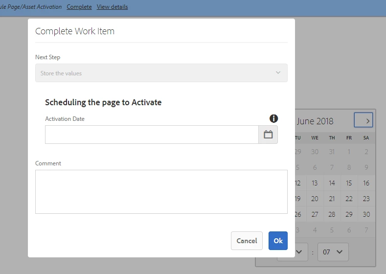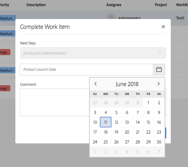 And from the page where we started the workflow the date time picker is behind the complete work item dialog. please find below