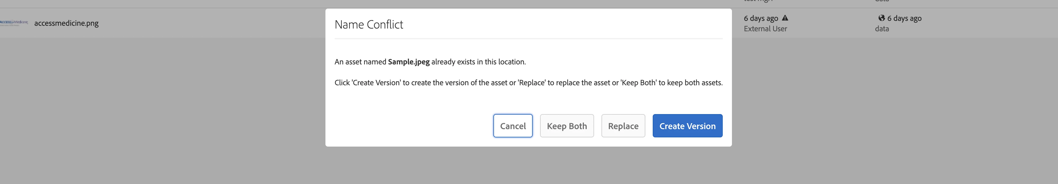 To recreate the scenario. In any assets folder, try to upload an asset which is already existing in the folder. in which case AEM will show you a pop-up which looks like this.