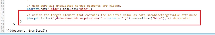 if you check this line, you can see that only the element with the "showhidetargetvalue" will be visible and everything else will be hidden via line 63. So what we should do is to modify this line to make the field visible for one more value. The beauty of data- attributes is that you can give any name and add a data-* attribute to your HTML element. So I will create another data-* attribute element and add to the field.
