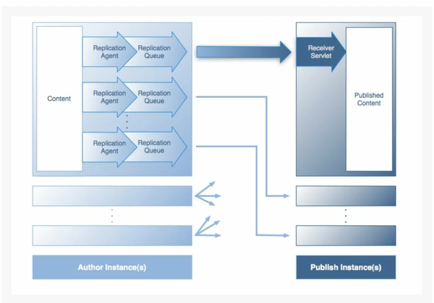 • a servlet in the publish environment receives the request and publishes the received content; the default servlet is http://localhost:4503/bin/receive.