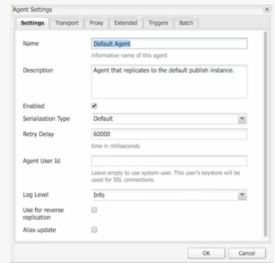 6. The values provided should be sufficient for a default installation. If you make changes then click OK to save them (see Replication Agents - Configuration Parameters for more details of the individual parameters).