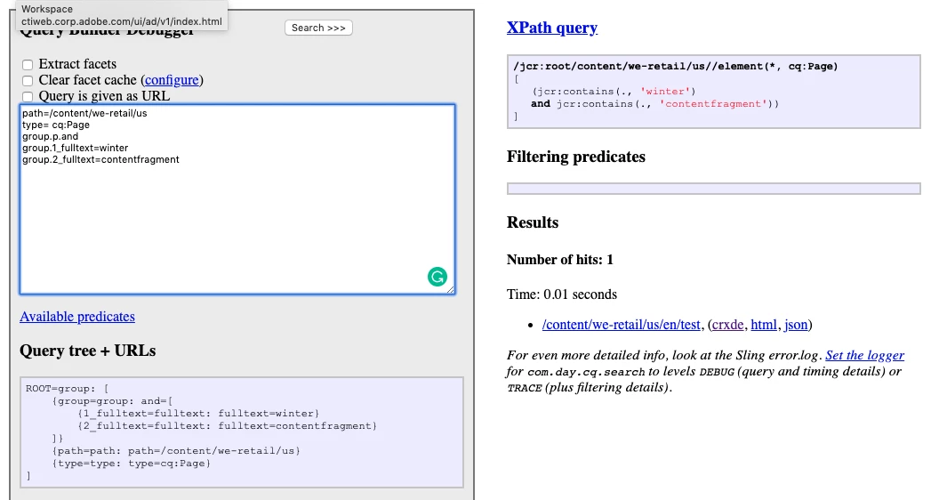 I have added a Content Fragment core component on an empty content page (newly created) and authored all the required values for the component including fragmentPath. The component renders as expected and displays the Content Fragment data. However, when I tried searching for the data within content fragment using the following sample queries through Query Builder Debugger, it did not return any results. I am not sure if any new predicates are needed to enable the search functionality for content fragments.