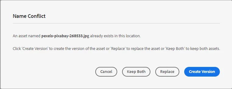 | Improved/Expected Behavior: | The system should prompt the user to make the same selections upon a move that it does upon an upload. The options are: "NAME CONFLICT An asset named ex.1234567.pdf already exists in this location. Click Create Version to create the version of the asset or Replace to replace the asset or Keep Both to keep both assets." |