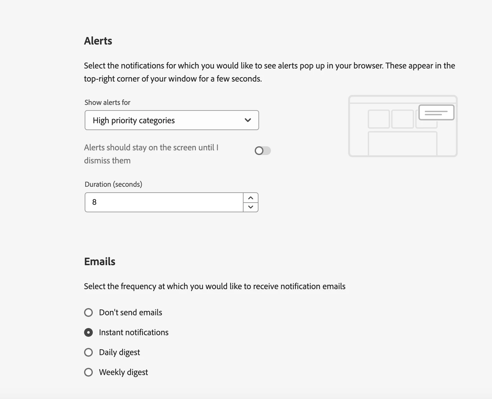 | Current/Experienced Behavior: | Notifications can either be sent via email for each instance or displayed in the notification area, depending on the chosen configuration. |