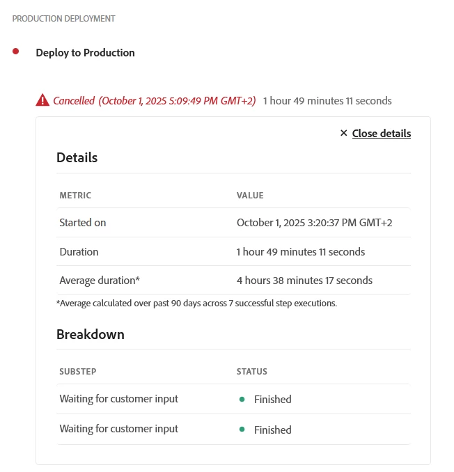 Currently, when a pipeline is running in Adobe Cloud Manager, the “Stop Execution” button can be clicked at any time during the deployment process. As a result, users must restart the entire process, even if the interruption was accidental. Although Cloud Manager reuses the same package, some steps still need to be repeated, which causes unnecessary delays and additional manual work. |