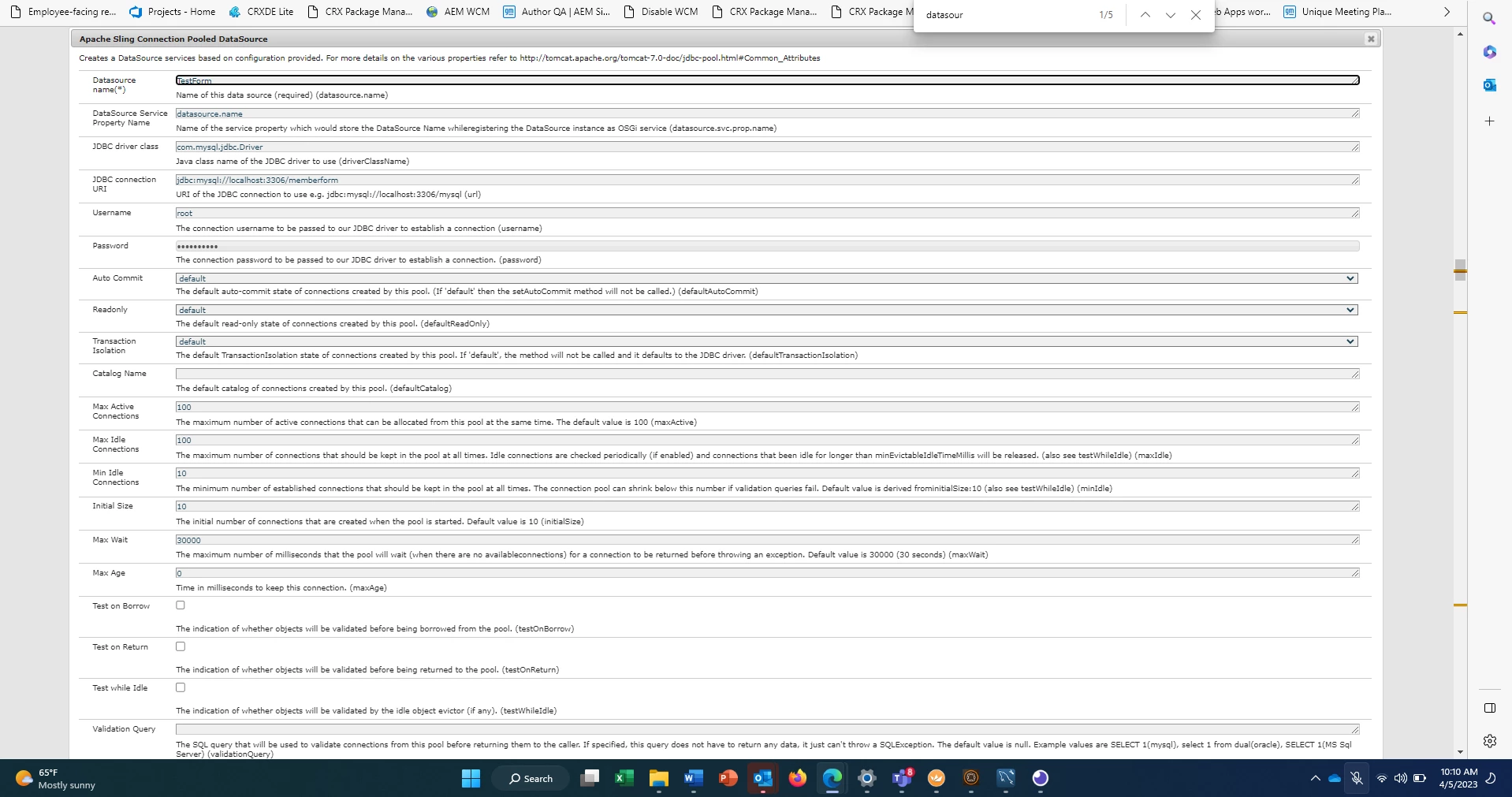 I am trying to create a Form Data Model, but it is not fetching the DataSource I created. I uploaded and installed the current JDBC Driver for MySQL. I then created my DataSource, and I will have a screenshot of that below. I have already tried this configuration in my local instance, but when I decided to upload AEM Forms and create a FDM in our DEV instance, I am getting an error.