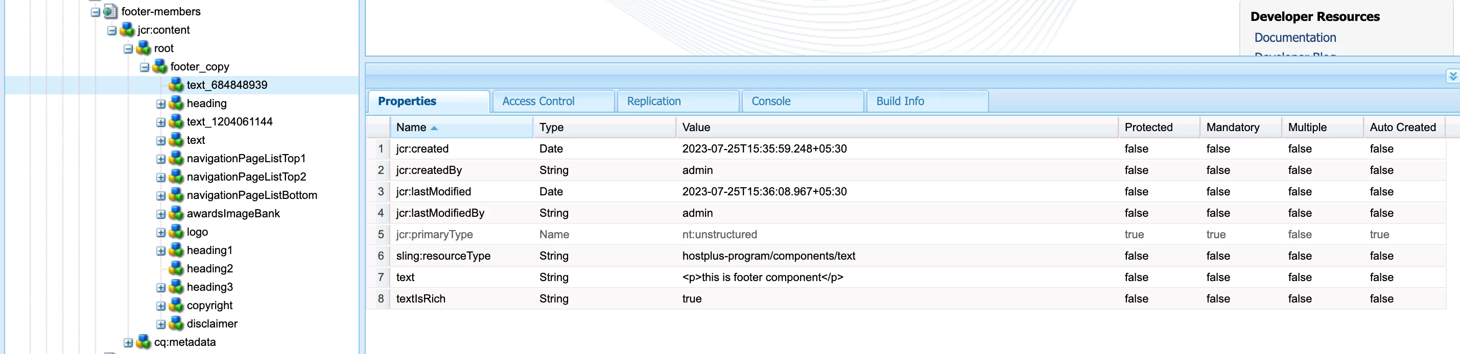 I can add component into footer on top of existing image or text component using + symbol(add component) and I see those dropped text component persist in CRXDE as nodes as below: